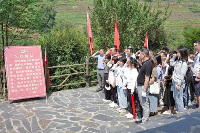 隨后大家頂著(zhù)炎炎烈日踏上當年紅軍的長(cháng)征路。將近1個(gè)小時(shí)的路程,讓大家隔空對話(huà)革命先輩,沉浸式感悟先輩們的艱辛歷程,通過(guò)沿途對紅軍巖、白面瑤寨博物館的參觀(guān),了解紅軍保護各族人民群眾的決心和百折不撓的革命精神,堅定我們今天鑄牢中華民族共同體意識、凝聚力量建設新時(shí)代壯美廣西的信心。在紅軍巖,后勤財務(wù)黨支部書(shū)記農劍峰領(lǐng)誓,全體黨員重溫了入黨誓詞。