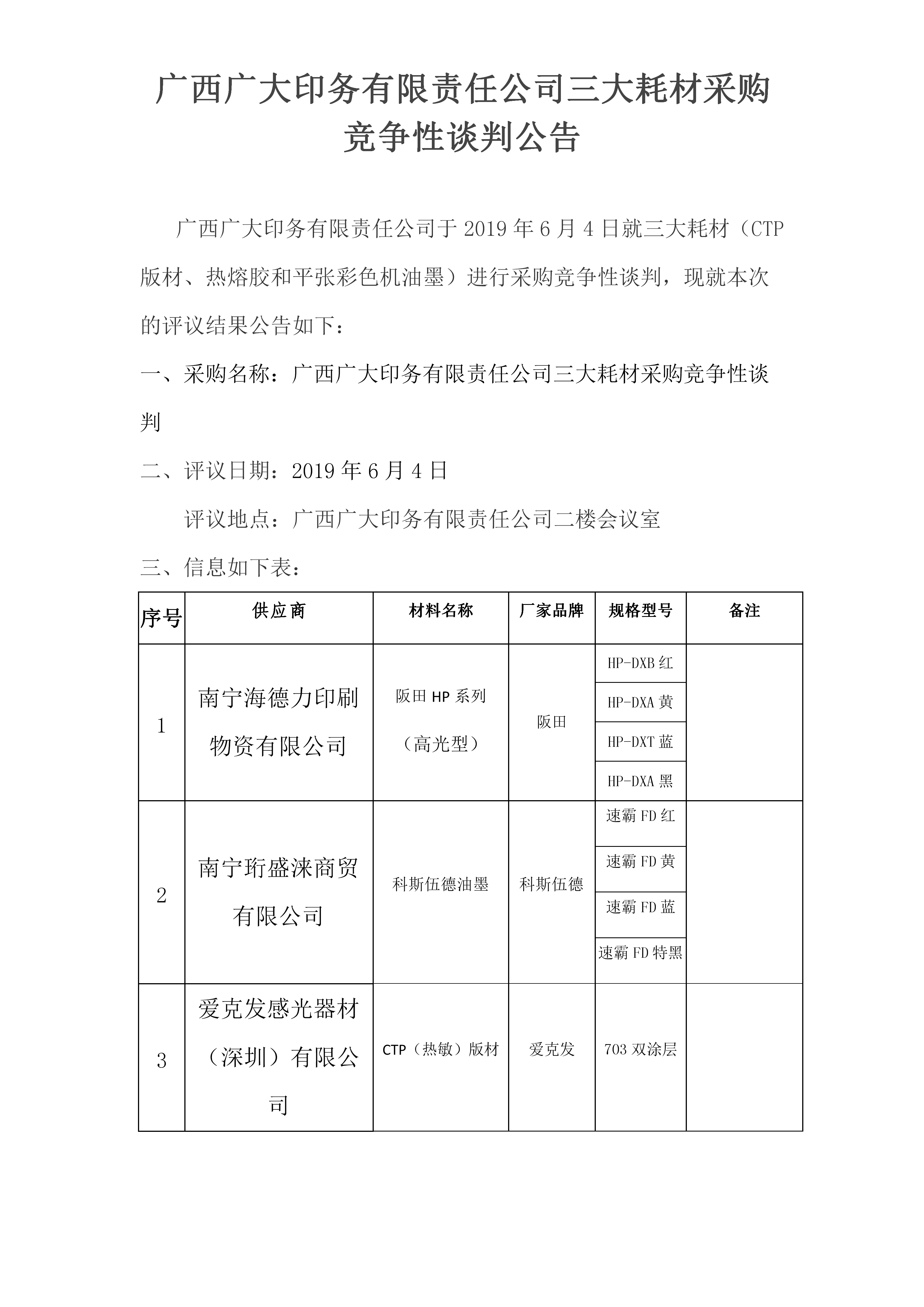 廣西廣大印務(wù)有限責任公司三大耗材采購競爭性談判公告